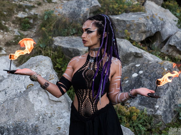 Full of flow and grace, Fire Enchantress practices a range of skills including fire poi, fire palms, double fire staff and fire rope dart!