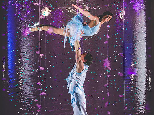 Glitter continuously falls over them whilst they showcase stunning acrobatics and incredible flexibility & strength.